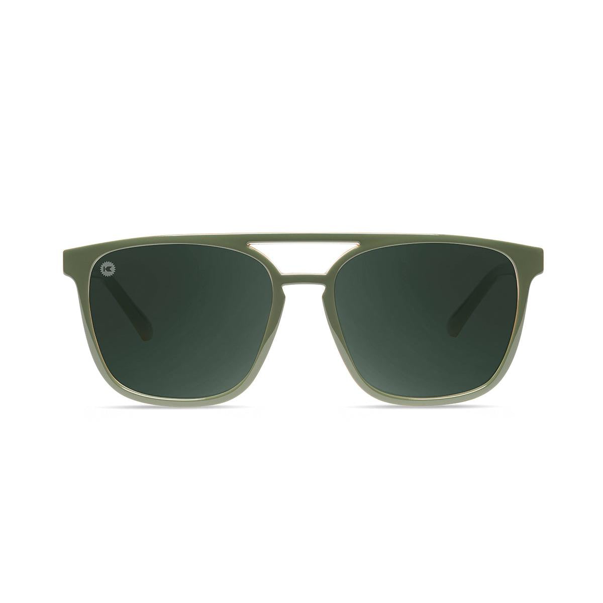 The Coyote Calls Brightsides sunglasses feature a two-tone design with a glossy olive green exterior and an amber interior for a subtle, versatile look. Polarized aviator green lenses provide full UV400 protection and impact resistance, making them suitable for daily wear. Finished with silver K-logo accents and spring hinges for added comfort.