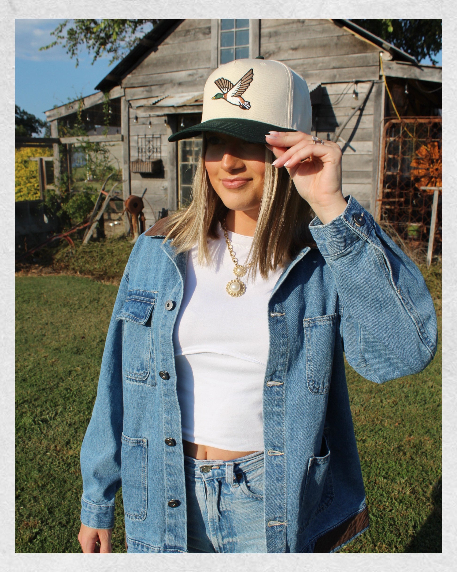 A timeless cap with an outdoor edge. This5-panel trucker hat features a beautifully embroidered flying mallard graphic, blending vintage Americana style with modern comfort. The two-tone design with contrasting bill colors adds a bold accent to the neutral crown, making it a versatile piece for any wardrobe.